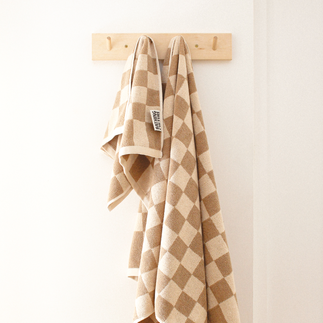 Bring the bathhouse home with these tile-inspired, organic cotton towels in a natural colorway. Crafted from premium yarn-dyed cotton at 600gsm in Portugal. Available in body and hand sizes, and suited to every kind of bathing experience. -Made from GOTS certified organic cotton -600 GSM (grams per square meter) -Tonal colorways inspired by California nature -Ethically loomed and yarn-dyed in Portugal. By Bathing Culture